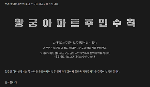 외부인의 출입을 철저히 막아선 채 아파트 주민만을 위한 새로운 규칙을 만든다.